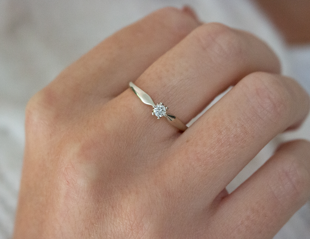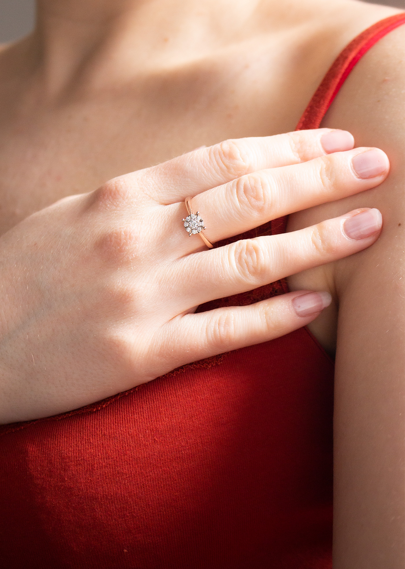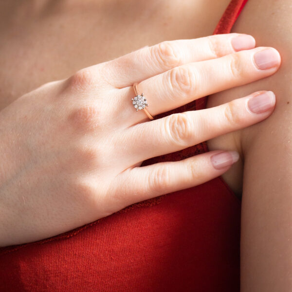 Złoty pierścionek z centralnym kamieniem o masie 0,30 ct (SI1/E), wykończony 6 mniejszymi diamentami o łącznej masie 0,036 (SI1/G) ct - próba 0,585