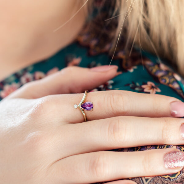Pierścionek z białego złota w kształcie łuku z fioletowym szafirem 0,83 ct oraz diamentem 0,02 ct - próba 0,585